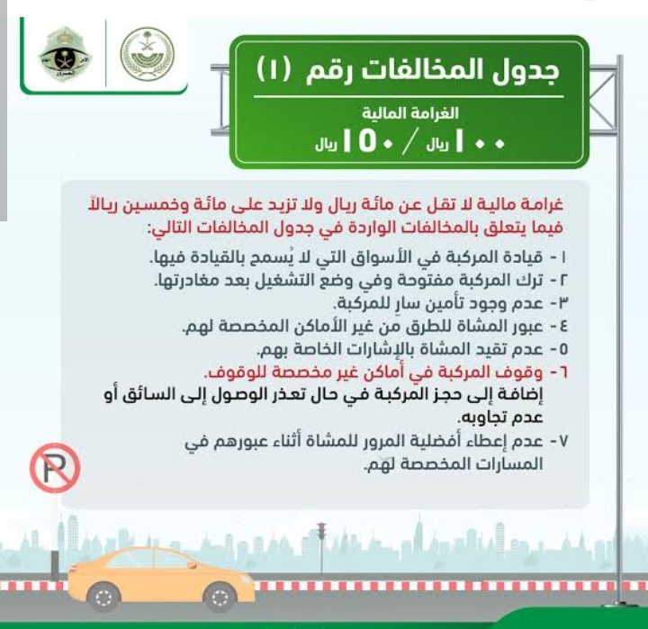 غرامة المخالفة المرورية بمقدار يتراوح ما بين 100 إلي 150 ريال سعودي