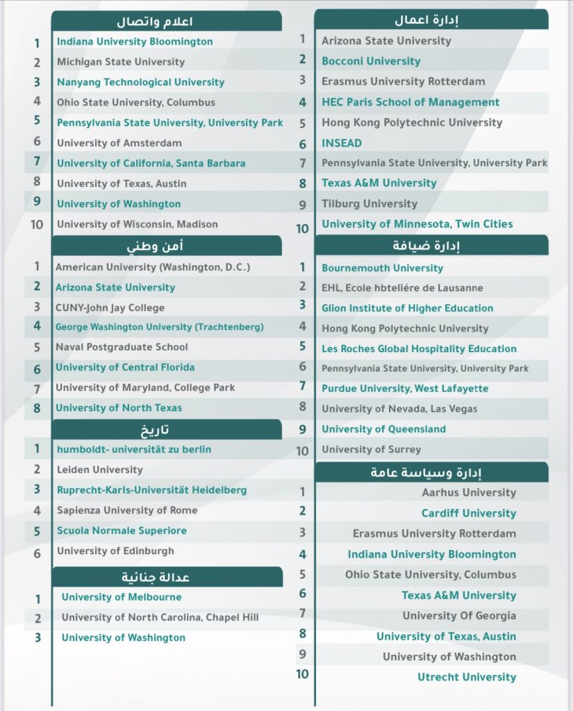 الجامعات العامة : تشمل جميع تخصصات المسار ماعدا إدارة الأعمال – الأمن الوطني – العدالة الجنائية – العلوم السياسية والعلاقات الدولية . حيث توجد قوائم جامعات خاصة لتلك التخصصات.